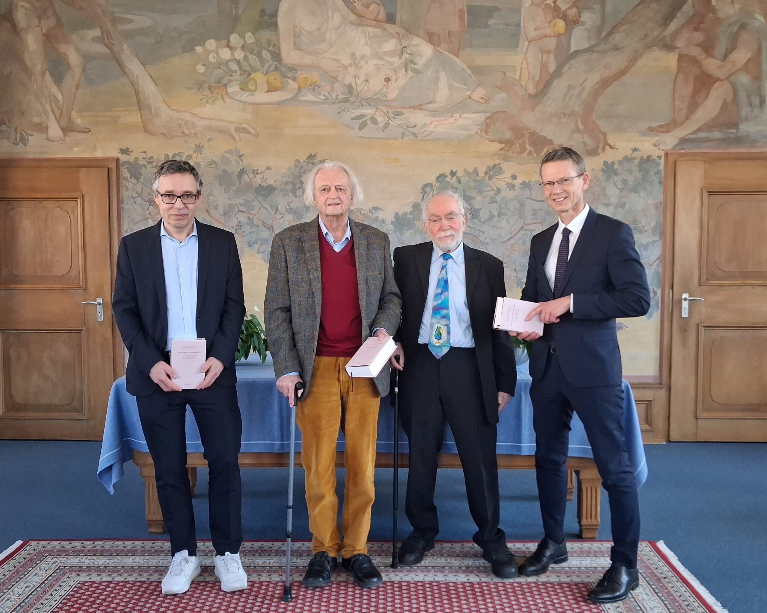 Im Bild von links: Prof. Dr. Maximilian Bergengruen (1. Vorsitzender der Rückert-Gesellschaft), Dr. Rudolf Kreutner (Herausgeber), Prof. Dr. Hartmut Bobzin (Herausgeber) und Oberbürgermeister Sebastian Remelé bei der feierlichen Vorstellung der aktualisierten Ausgabe von Friedrich Rückerts „Der Koran Mohammed’s, aus dem Arabischen poetisch übertragen“ im Trausaal der Stadt Schweinfurt.