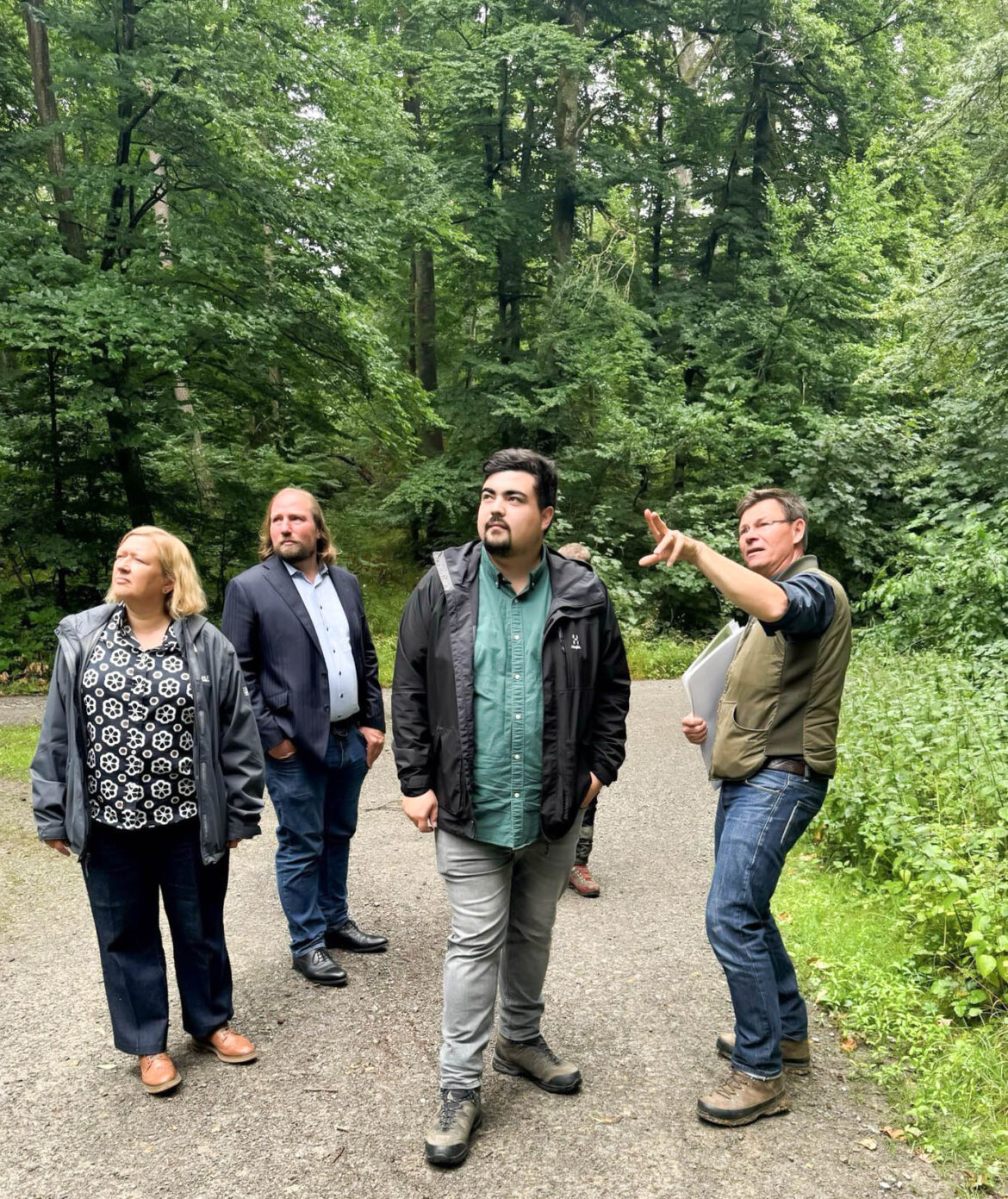 Der Würzburger Stadtwald ist weit mehr als ein Naherholungsgebiet. Er ist Klimaschützer, Wasserspeicher, Lebensraum für seltene Tiere und Pflanzen – und ein herausragendes Beispiel für nachhaltiges Waldmanagement in Deutschland. Denn gezielte Maßnahmen stärken den Würzburger Wald für die Zukunft. Welche das sind, davon überzeugten sich kürzlich auf Einladung von Oberbürgermeister Martin Heilig und der zweiten Bürgermeisterin Dr. Sandra Vorlová die Bundestagsabgeordneten Anton Hofreiter und Niklas Wagener (Aschaffenburg) bei einem zweistündigen Waldrundgang mit Stadtförster Karl-Georg Schönmüller, dem städtischen Forstwirt Quirin Friederich und dem Leiter des Gartenamts, Dr. Helge Bert Grob.