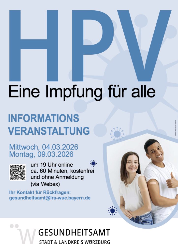 Das Gesundheitsamt für Stadt und Landkreis Würzburg lädt Eltern zu einem kostenfreien Informationsabend rund um die HPV-Impfung ein. Interessierte können am Mittwoch, 4. März 2026, oder Montag, 9. März 2026, jeweils von 19 bis 20 Uhr online über die Videokonferenz-Software Webex teilnehmen. Eine vorherige Anmeldung ist nicht erforderlich.