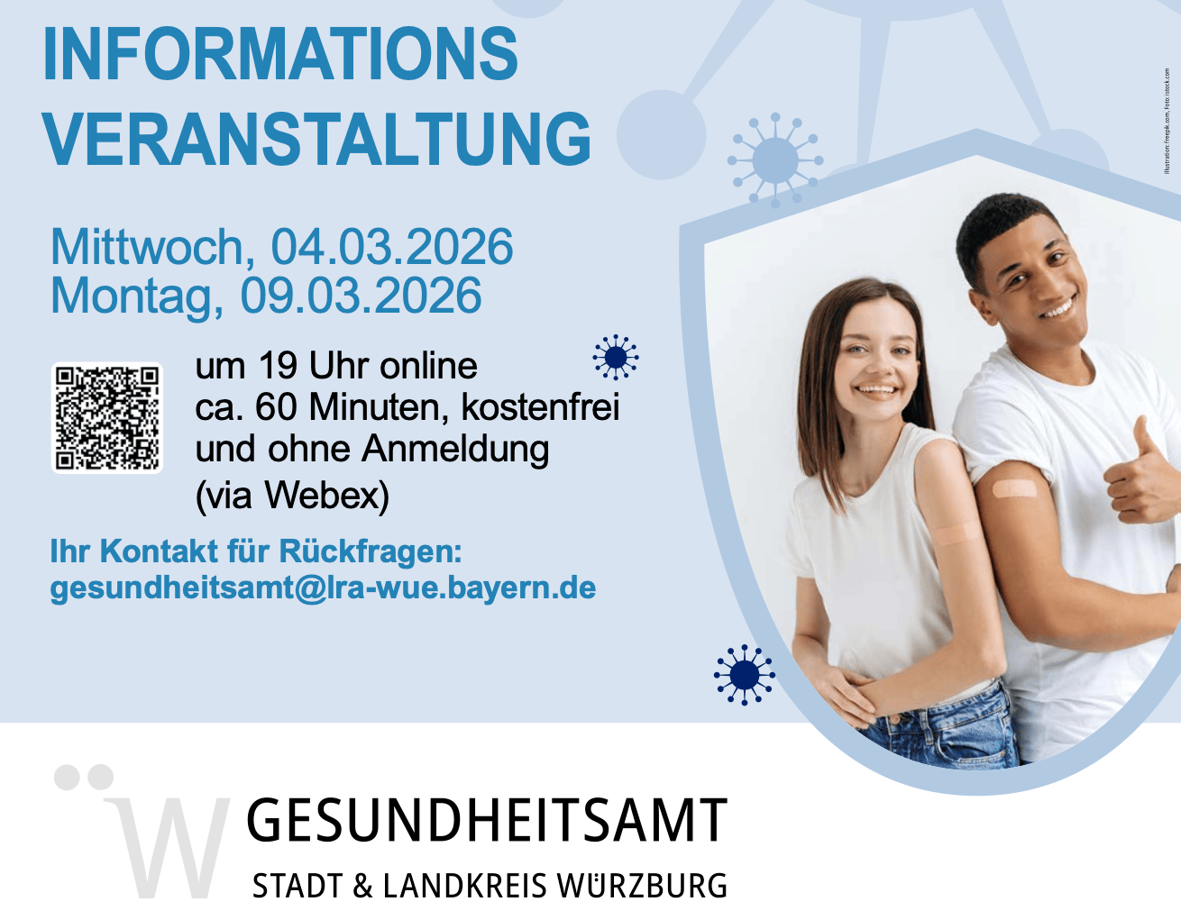 Das Gesundheitsamt für Stadt und Landkreis Würzburg lädt Eltern zu einem kostenfreien Informationsabend rund um die HPV-Impfung ein. Interessierte können am Mittwoch, 4. März 2026, oder Montag, 9. März 2026, jeweils von 19 bis 20 Uhr online über die Videokonferenz-Software Webex teilnehmen. Eine vorherige Anmeldung ist nicht erforderlich.