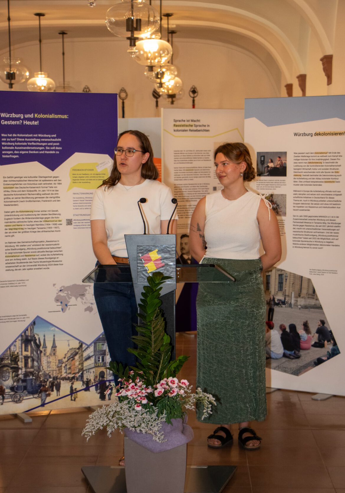 Großer Zuspruch im Rathaus bei der Vernissage zu einem sensiblen Thema: Zwei der Ausstellungsmacherinnen, Jana Sierig und Johanna Rieger (von links), erläutern den Gästen den Ansatz der Kolonialismus-Ausstellung, die auf konkrete Rückmeldungen der Besucherinnen und Besucher setzt und zur Vertiefung ein umfangreiches Begleitprogramm mit Stadtrundgängen und zahlreichen Vorträgen über den gesamten Juli im Angebot hat. Weitere Informationen unter: https://www.phil.uni-wuerzburg.de/museologie/ Foto: Georg Wagenbrenner