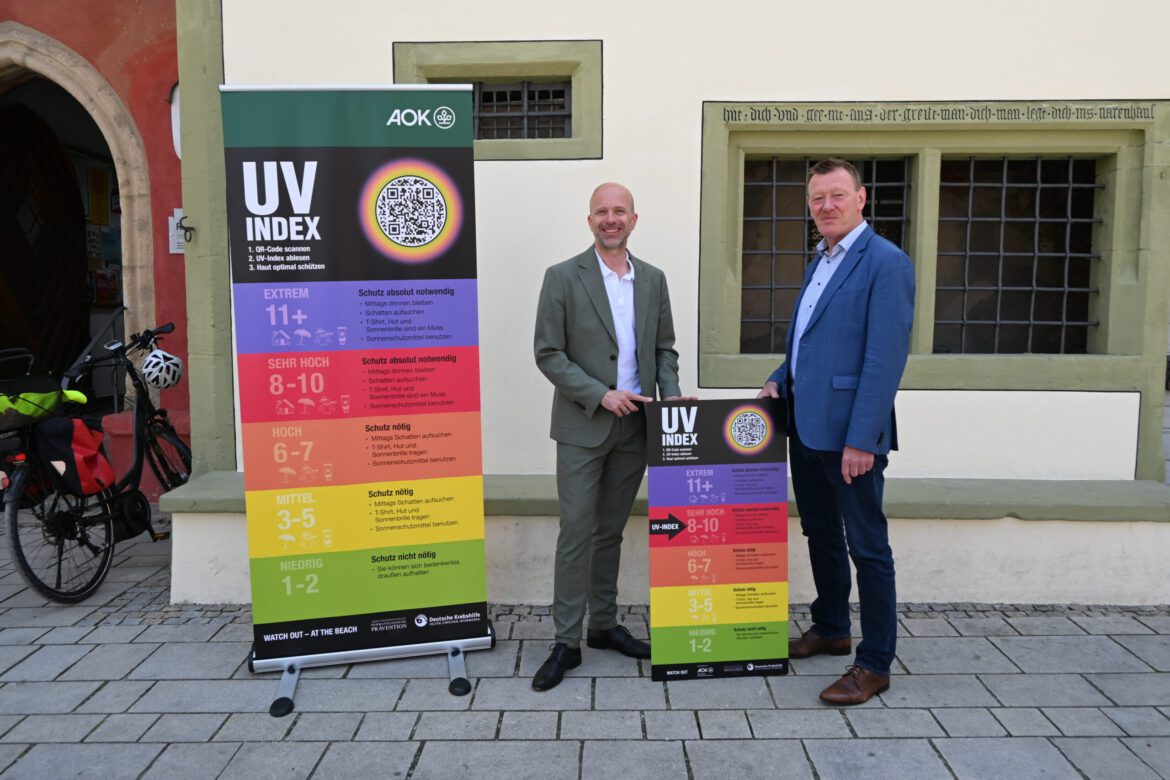 Unsere Sonne ist lebenswichtig, ohne sie wäre ein Leben auf der Erde nicht denkbar. Zuviel Sonneneinstrahlung ist für den menschlichen Körper allerdings belastend. So birgt die UV-Strahlung der Sonne gesundheitliche Risiken, denn sie kann Haut und Augen schädigen oder langfristig sogar Krebs auslösen. „Zum Schutz vor den möglichen Gefahren stellt die AOK jetzt UV-Index-Tafeln zur Verfügung“, sagt Alexander Pröbstle, Direktor der AOK in Würzburg. Der UV-Index (UVI) zeigt den am Boden erwarteten Tagesspitzenwert der sonnenbrandwirksamen UV-Strahlung an. Die Tafeln wurden von der Arbeitsgemeinschaft Dermatologische Prävention (ADP) & Deutsche Krebshilfe entworfen. „Die AOK will gemeinsam mit regionalen Partnern über die Bedeutung von Sonnenschutz in Zeiten des Klimawandels aufklären“, so Alexander Pröbstle. Ziel ist es, die UV-Index-Tafeln an den Orten aufzustellen, an denen eine erhöhte Sonnenbrandgefährdung besteht, wie beispielsweise in Freibädern oder an öffentlichen Plätzen.