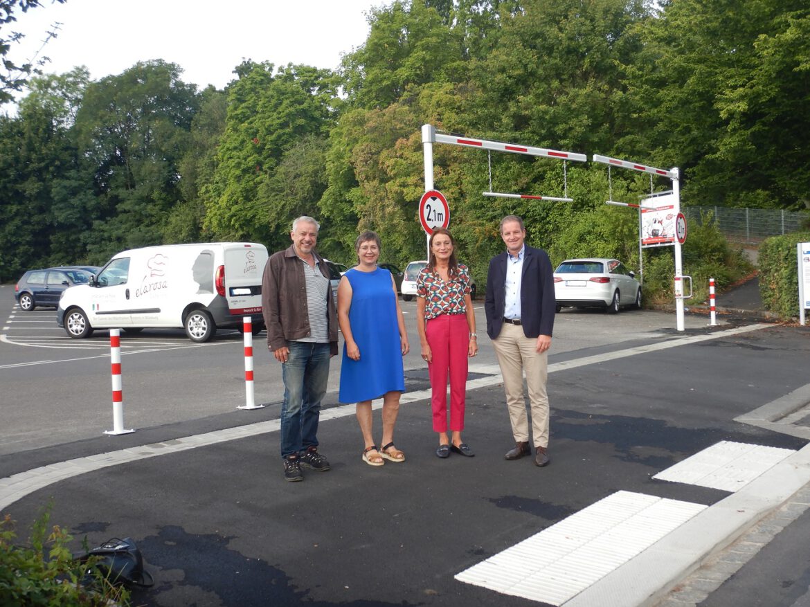 Der Parkplatz am Dallenbergbad kann barrierefrei erreicht werden – sowohl zu Fuß als auch mit Rollstuhl und Kinderwagen. Ein neuer Gehweg und eine Querungsstelle stellen sicher, dass mobilitätseingeschränkte Personen, aber auch Familien mit Kinder- oder Bollerwägen sicher die König-Heinrich-Straße vom Parkplatz zum Freibad oder in anderer Richtung zur Akon Arena passieren können.
