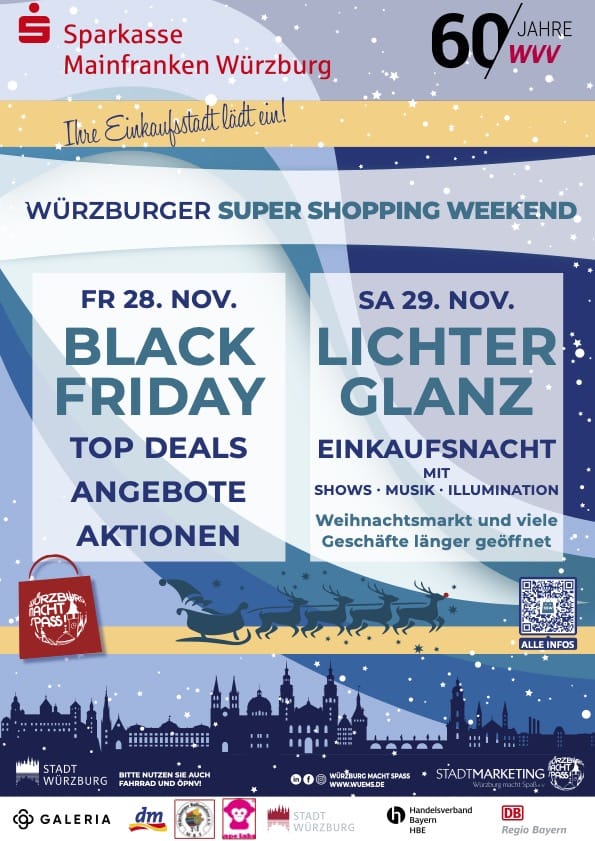 Somit werden „Black Friday Würzburg“ und „Lichterglanz“ zu einem großen „Super Shopping Weekend“ für die gesamte Stadt vereint – für maximale Sichtbarkeit, mehr Besucher sowie noch bessere Chancen für alle teilnehmenden Unternehmen. Die Aktion wächst über die Innenstadt hinaus, macht Würzburgs Einkaufs- und Erlebnisvielfalt noch sichtbarer und läutet den Start ins Weihnachtsgeschäft ein.