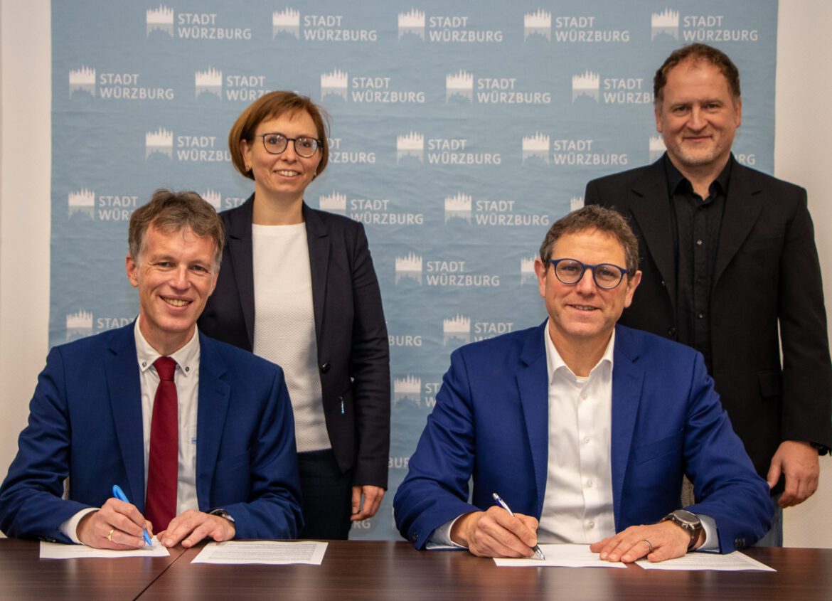 Kurze Wege in Würzburg nutzen: Grünewald-Schulleiter Dr. Holger Saurenbach, die Geschäftsführerin der Sing- und Musikschule Würzburg Anne-Katrin Kuhn, Oberbürgermeister Martin Heilig und Andreas Straßer, Pädagogischer Schulleiter bei der Vertragsunterzeichnung im Rathaus. Foto: Georg Wagenbrenner
