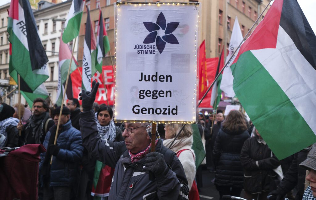 Almanya’nın İsrail’e silah sağlamasına tepki gösteren göstericiler, eylemde üzerinde “Almanya uyarıyor, İsrail devam ediyor. Yaptırımlar ve silah ambargosu şimdi”, “Netanyahu yargılansın”, “Soykırımı durdurun” ve “Bir soykırım diğerini haklı çıkarmaz” yazan döviz ve pankartlar taşıdı.