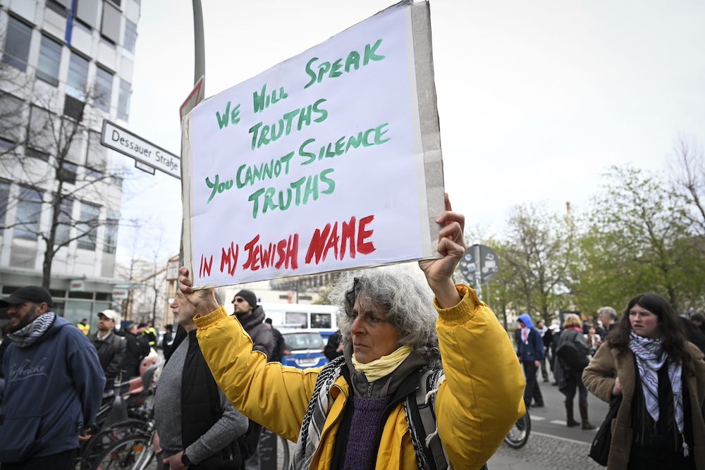 Berlin Eyalet Meclisinin yakınlarında bulunan Stresemann Caddesi’nde toplanan 100’ün üzerinde gösterici, Filistin’e destek gösterilerine katılan biri ABD, ikisi İrlanda ve diğeri Polonya vatandaşı 4 kişi hakkında sınır dışı edilme kararı alınmasını protesto etti.
