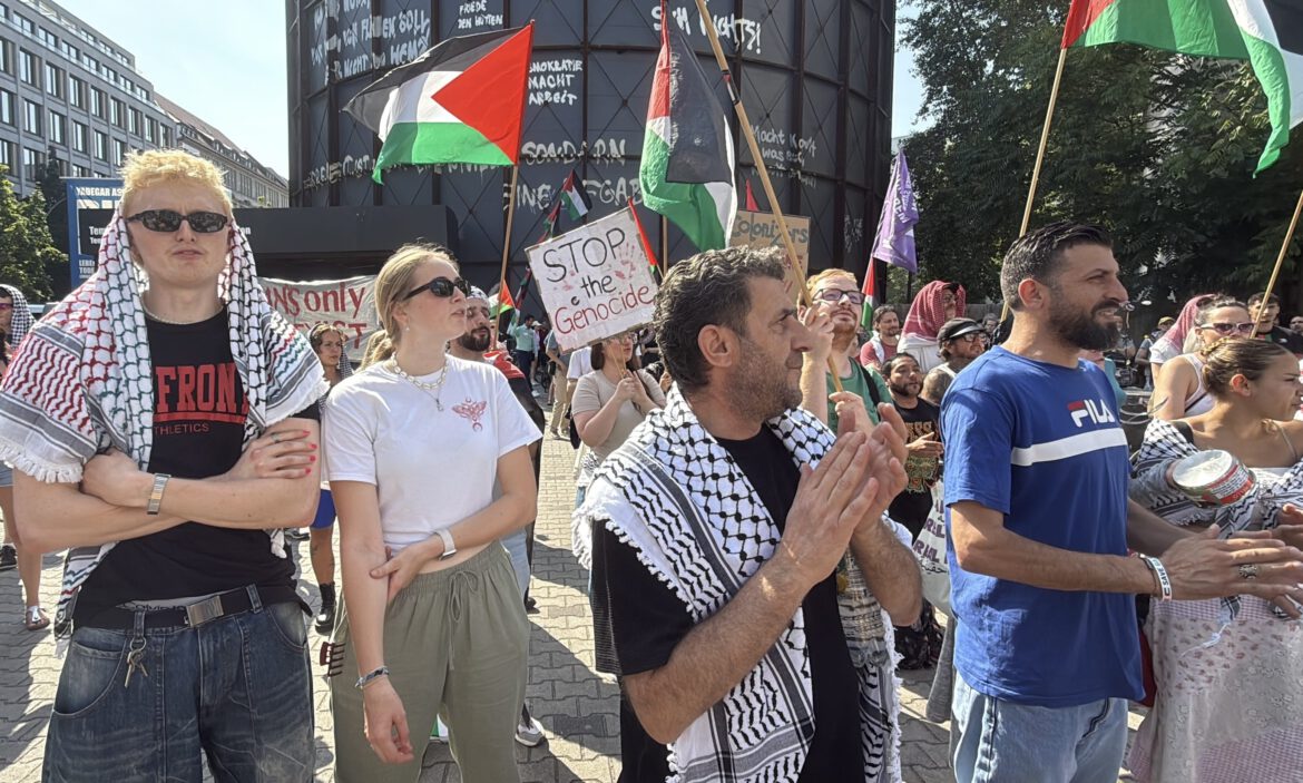Mitte semtindeki Friedrich ve Zimmer caddelerinin kesiştiği meydanda Filistin’i desteklemek ve İsrail’in Gazze’ye yönelik saldırılarını protesto etmek için 200’ün üzerinde kişi toplandı.