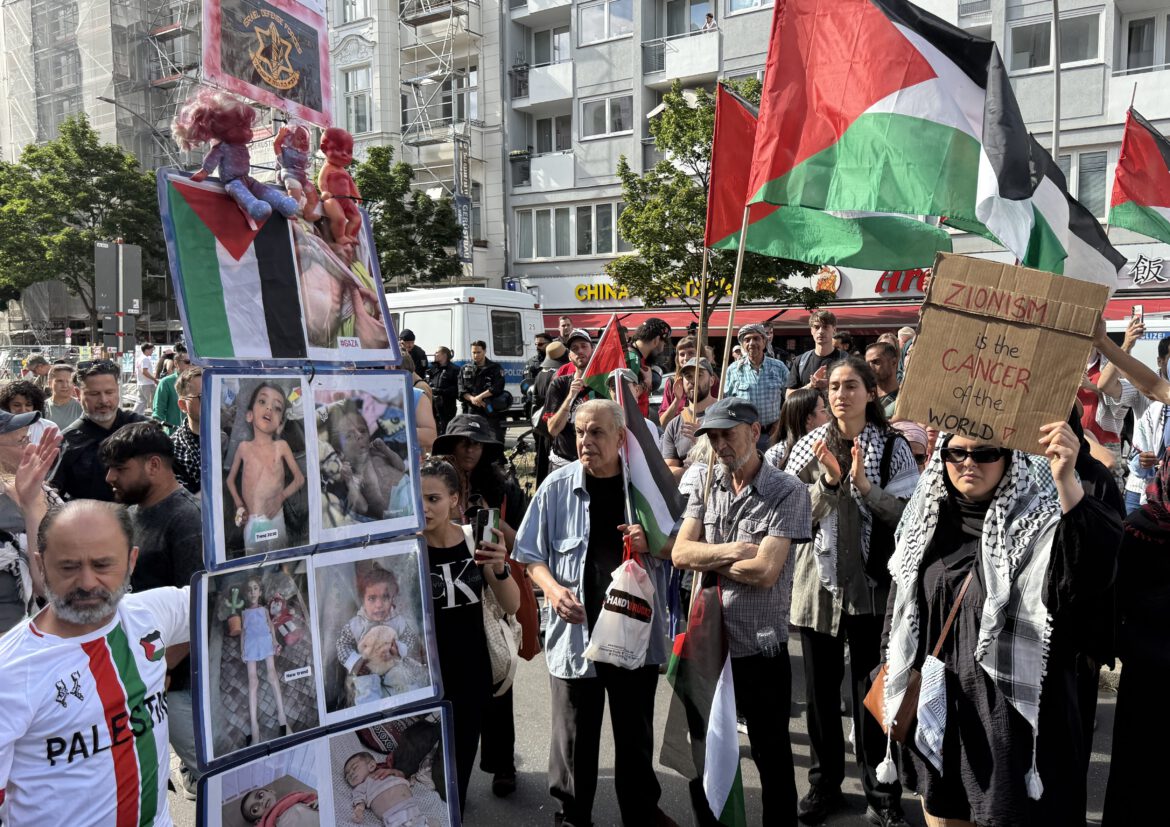 Eylemde, İsrail’e silah sağlayan Alman hükümeti ve İsrail’in aleyhine sloganlar atıldı.
