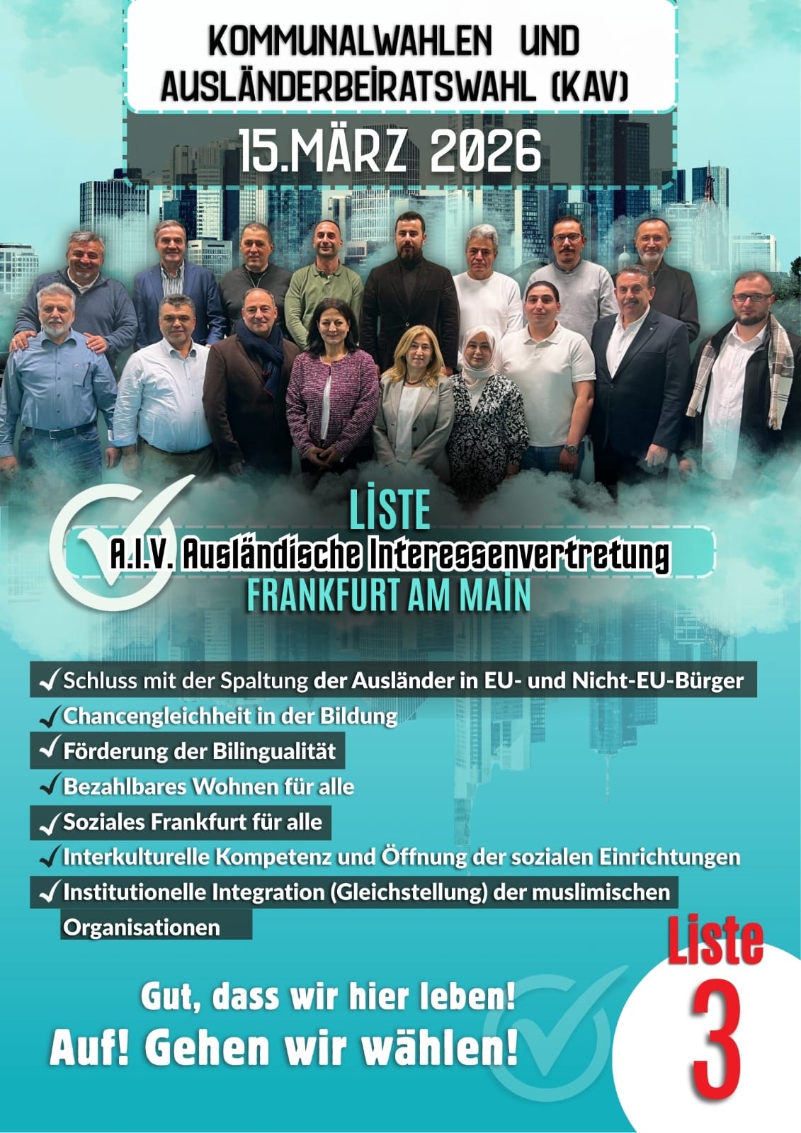 sizleri, severek yaşadığımız Frankfurt şehrinde demokratik olarak temsil ve sizlere hizmet edebilmek için oylarınıza talibiz, mektupla veya 15 Mart 2026 Pazar günü sandıkta 3’üncü „Ausländische Interessenvertretung – A.I.V.“ listesine vermenizi saygılarımızla istirham ediyoruz.