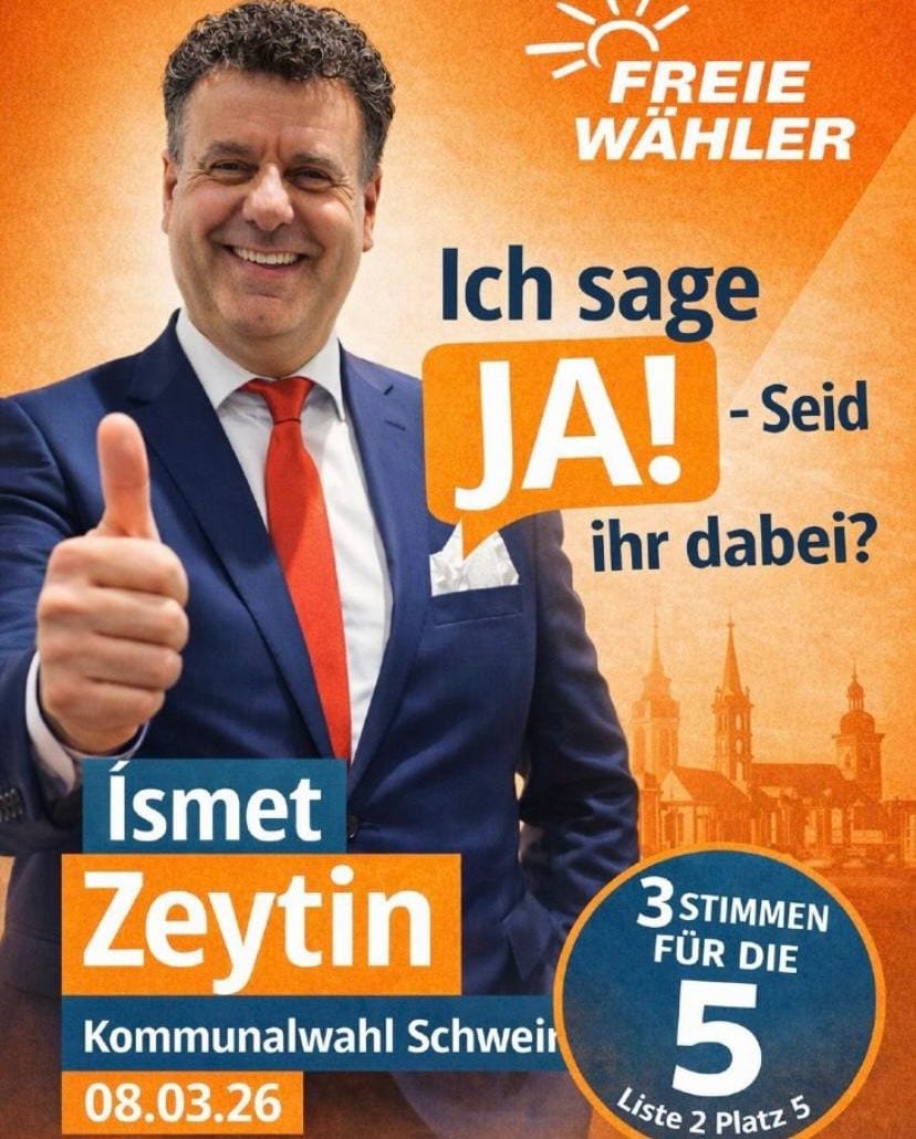 Freie Wähler listesinden Schweinfurt Belediye Meclis üyeliğine aday olan İsmet Zeytin, yerel siyasette göçmen kökenli vatandaşların temsil gücünün artırılmasının önemine dikkat çekti. Uzun yıllardır Schweinfurt’ta yaşayan ve şehir hayatının birçok alanında aktif görevler üstlenen Zeytin, özellikle Türk toplumunun sahip olduğu oy potansiyelini daha güçlü ve bilinçli bir şekilde yerel siyasete yansıtmasının gerektiğini vurguladı.