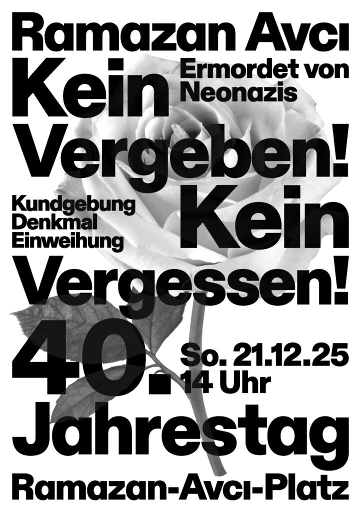 Almanya’nın Hamburg kentinde 1985’te Neonazilerin saldırısı sonucu yaşamını yitiren Ramazan Avcı, katledilişinin 40. yılında adını taşıyan meydanda düzenlenecek törenle anılacak. Anma etkinliği, 21 Aralık 2025 Pazar günü saat 14.00’te, Landwehr tren istasyonu önünde bulunan Ramazan Avcı-Platz’da gerçekleştirilecek.
