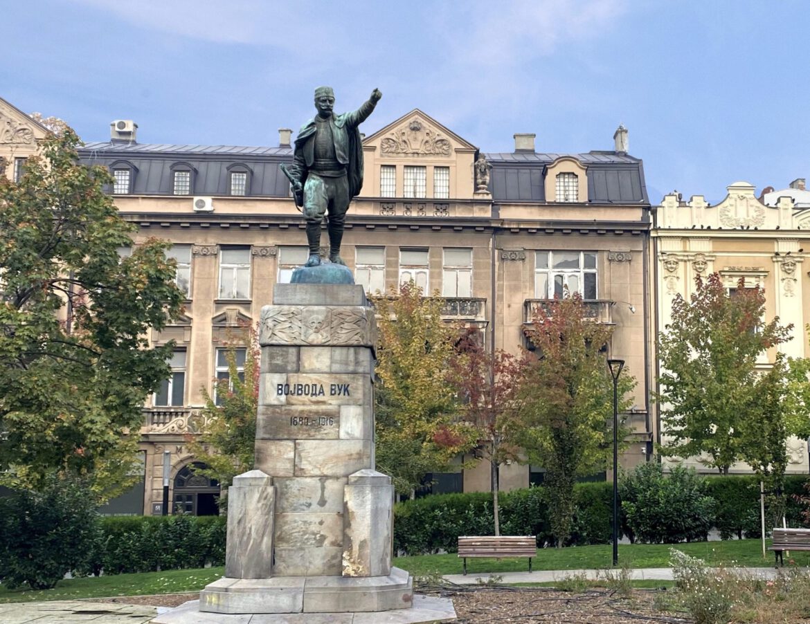 Foto 5: Sağ elindeki silah indirilmişken sol eli henüz kurtarılmamış güney Sırbistan’daki kasabaları işaret eden Makedonya ve Eski Sırbistan’da Osmanlılara karşı savaşmış komutan Vojvoda Vuk Anıtı, 2014 yılında kültürel miras mülkü olarak belirlenmiş.