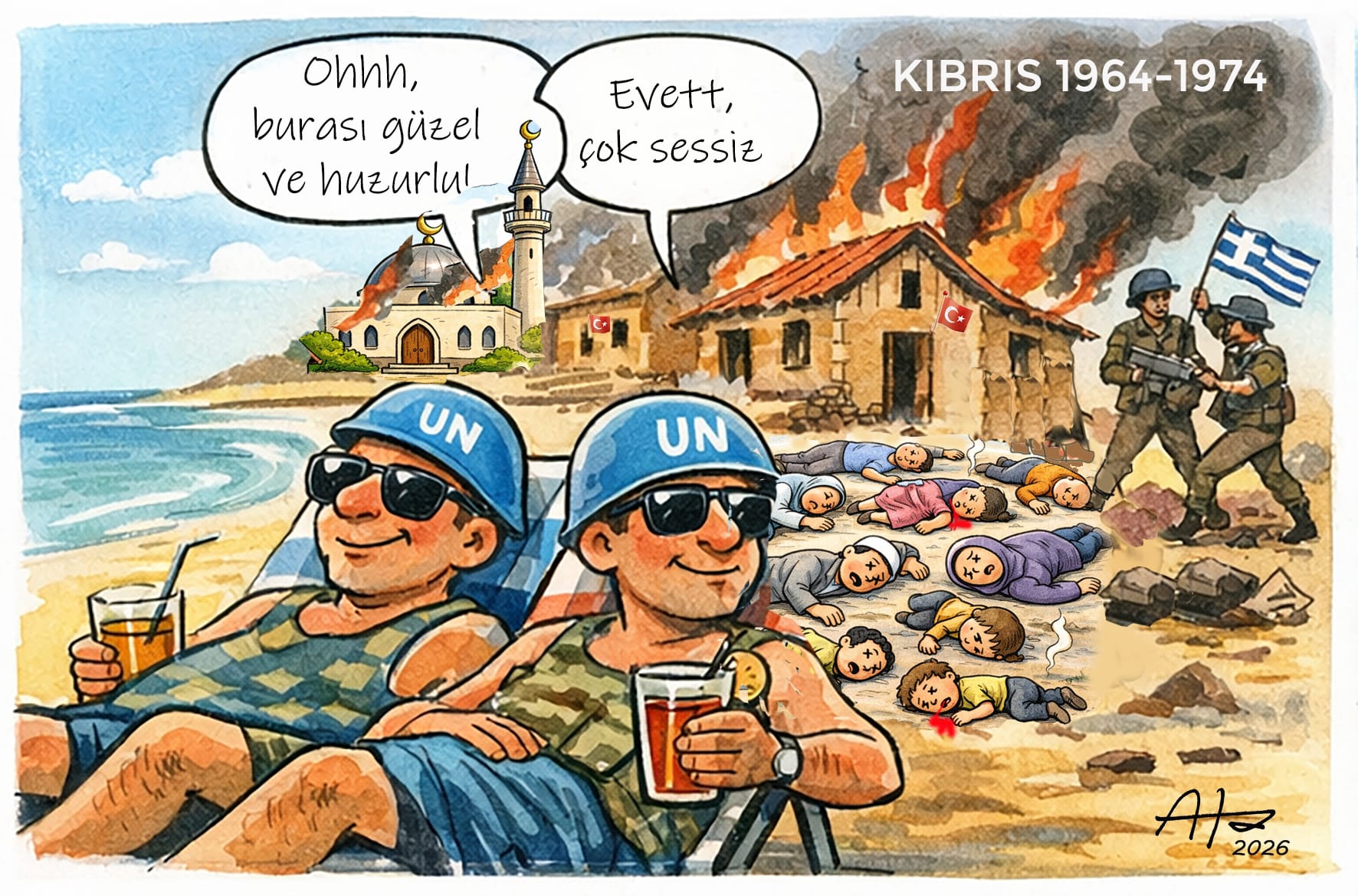 Tüm yaşanan katliamlara, felakete, soykırıma rağmen Kıbrıs adasına sözde barış getirmek için görevlendirilmiş Birleşmiş Milletler Barış Gücü askerlerinin her fırsatta plajlarda şezlong üzerinde güneşlenirken içkilerini yudumladıklarını, katliamlarla, işlenen insanlık suçlarıyla, yağmalarla hiç ilgilenmediklerini, Kıbrıs adasının hafızasında çok daha ağır, çok daha acı dolu sayfalar bulunduğunu unutmuş, nasıl olduysa.