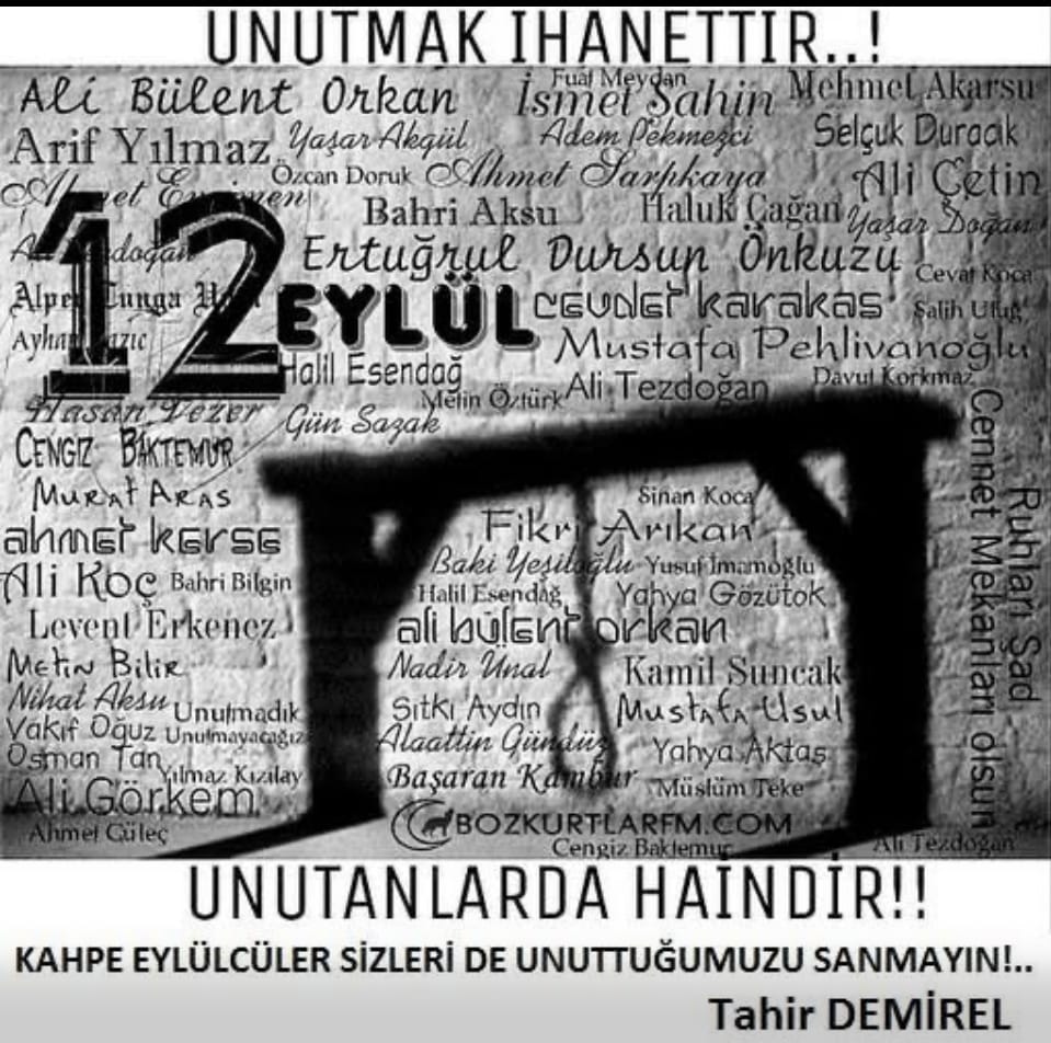 12 Eylül’ü anlamak için gerçekten isimlere de bakmamız gerekiyor. “Mustafalar ölür, Allah davası ölmez, milliyetçilik yaşar” diyen ve nişanlısına, sevdiğine mutlu bir yuva kurması için Cenab-ı Allah’a dua ederek arkasında mektup bırakan PEHLİVANOĞLU’yu bilmek gerekir. Son günlerinde köydeki anasını rüyasında gören KERSE’yi unutmamak gerekir ki: “Ölsem de ben ölmem, varın siz anlayın!” diyen sözlerini, “İlay-ı kelimetullah!” diyen diller lâl olmaz. Allah diye inleyen güller solmaz. Tekbir getiren, teşbih eden güller solmaz. “Susmayacak Hakk’ın dili!” dörtlüğünü ezberlemek gerekir. Görevli sorar: “Son bir arzun?” Güler. Görevli hiddetlenir: “Sana son arzunu soruyom sen gülüyorsun.” Ve cevap verir: “Beni öldü bileceklere gülüyorum. Temizim, pakım, Allah’ıma kavuşuyorum. Daha ne isteyeceğim? Hazırım ben.” diyen ORKAN’ı ağlamadan anmak mümkün değil. İdam ipine giderken bir bayrak ve Kur’an-ı Kerim’i isteyen Baktemur’u ve canını almak isteyen cellatların bunu iki kez yapmalarını ben nasıl unutayım. “Ya ölmeden öldüler” diyerek işkenceyle Başbuğumuzu suçlamaya kalkışıp iftira atmak isteyenleri ve bu durum karşında imanlarına ve ülkülerine yenilmeyen DURACIK’ı, ESENDAĞ’ı ben nasıl unuturum. Ya 3 gün cezaevinde kalıp onu savunacak bir avukatımız bile olmayınca yanlışlıkla öldürülen KARAKAŞ için ben ne yapayım. İnfaz edileceği zamanı tam olarak bilmediği için adeta ölüm orucunda gibi ağzına su bile koymayan şehidimi ben nasıl unuturum. Hele ki bunun sebebini öğrendiğimde imanımdan şüpheleneceğim aklıma bile gelmezdi. Öldükten sonra vücuttan bazı dışkılar çıkar ya işte Fikri ARIKAN, dünya hayatının son bulacağı bir anda bile abdestini koruma gayretiyle hareket etmiş, cellat sandalyesini tekmelediğinde vücudundan hiçbir dışkı çıksın istememişti. Bu asalet, bu terbiye, bu tevekkül, bu iman kolay rastlanabilir bir durum değildir.12 Eylül öncesi ve sonrası şüheda olan yiğit ülküdaşlarımı rahmetle minnetle anıyorum. Ruhları şad Mekanları cennet olsun inşallah.